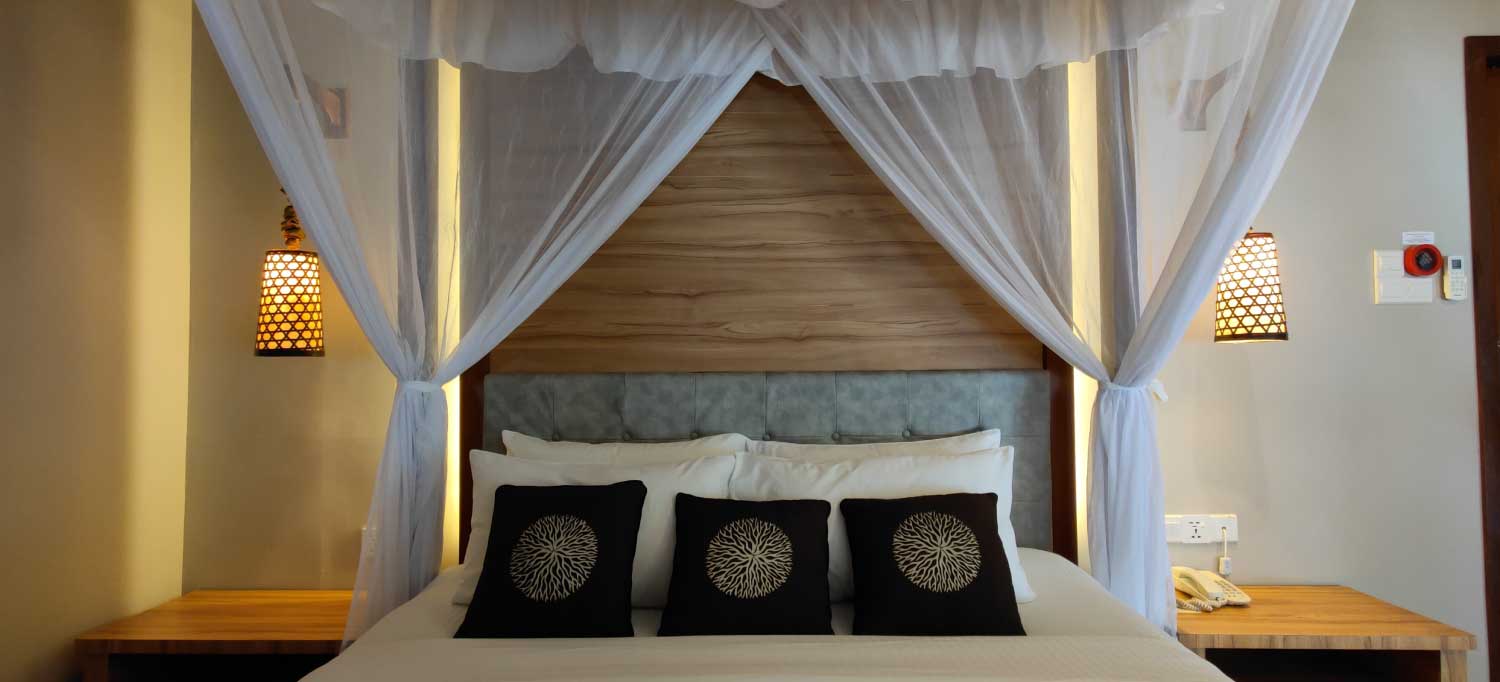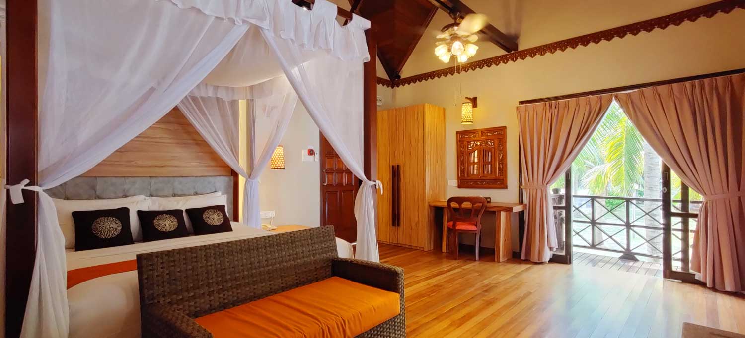 Ample, cozy space of King Chalet room provides a Bungalow-style design for family and honeymooners alike to rest on their glorious tropical escape.