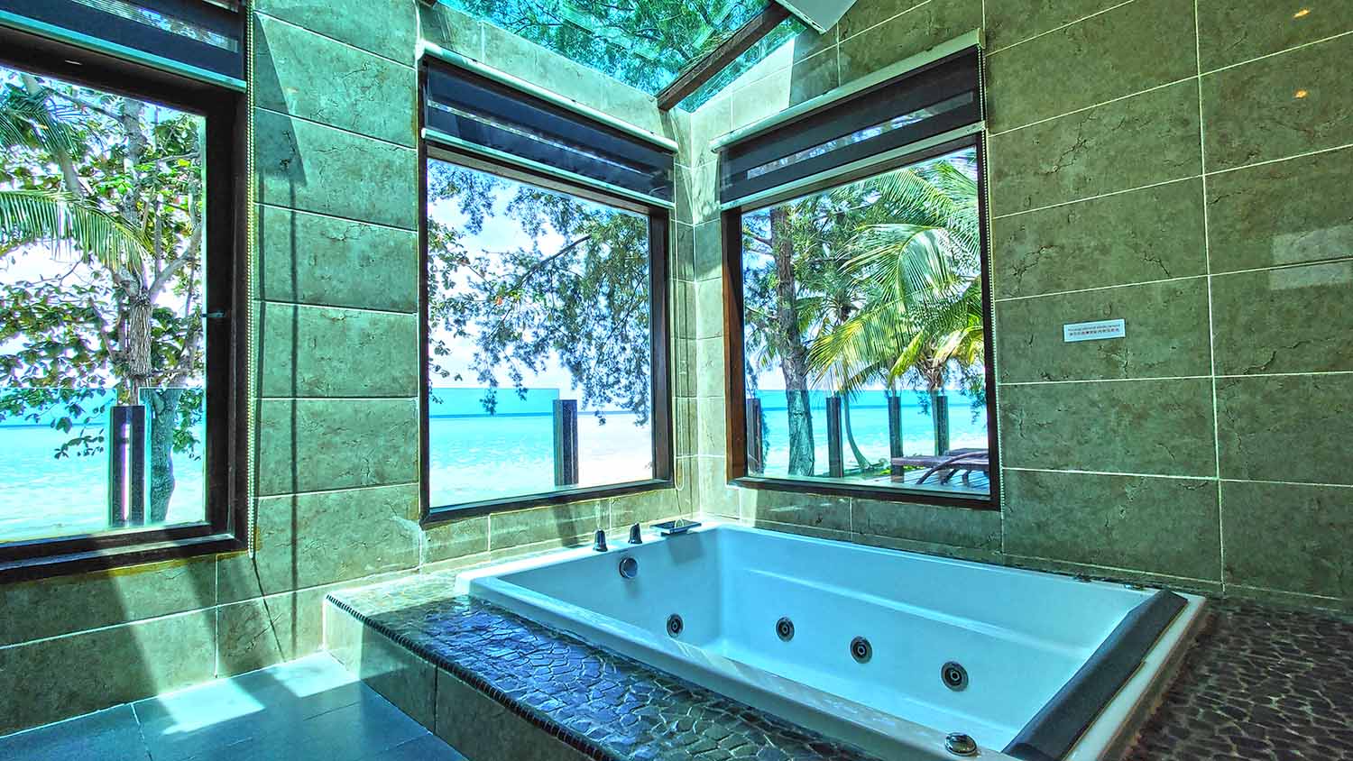 The semi-detached chalet features elegant wooden interior, with 2 bedrooms separated in the middle (king size bed, twin bed) with enchanting bathtub and alluring vista overlooking the pristine white sandy beach.