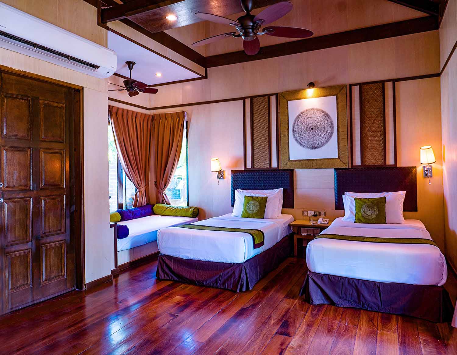 Designed with traditional Malaysian charm in mind, the Garden Deluxe View West is a perfect room for your family getaway. The spacious room can accommodate up to three adults and one child, with twin or king size double-bed configuration available. The room also features a magnificent private shower bathroom and also a private sun deck overlooking a lush garden. The individual sundeck is the perfect spot to laze away the hours with a good book and cool drink, or simply daydream while enjoying the scenic island and garden views.