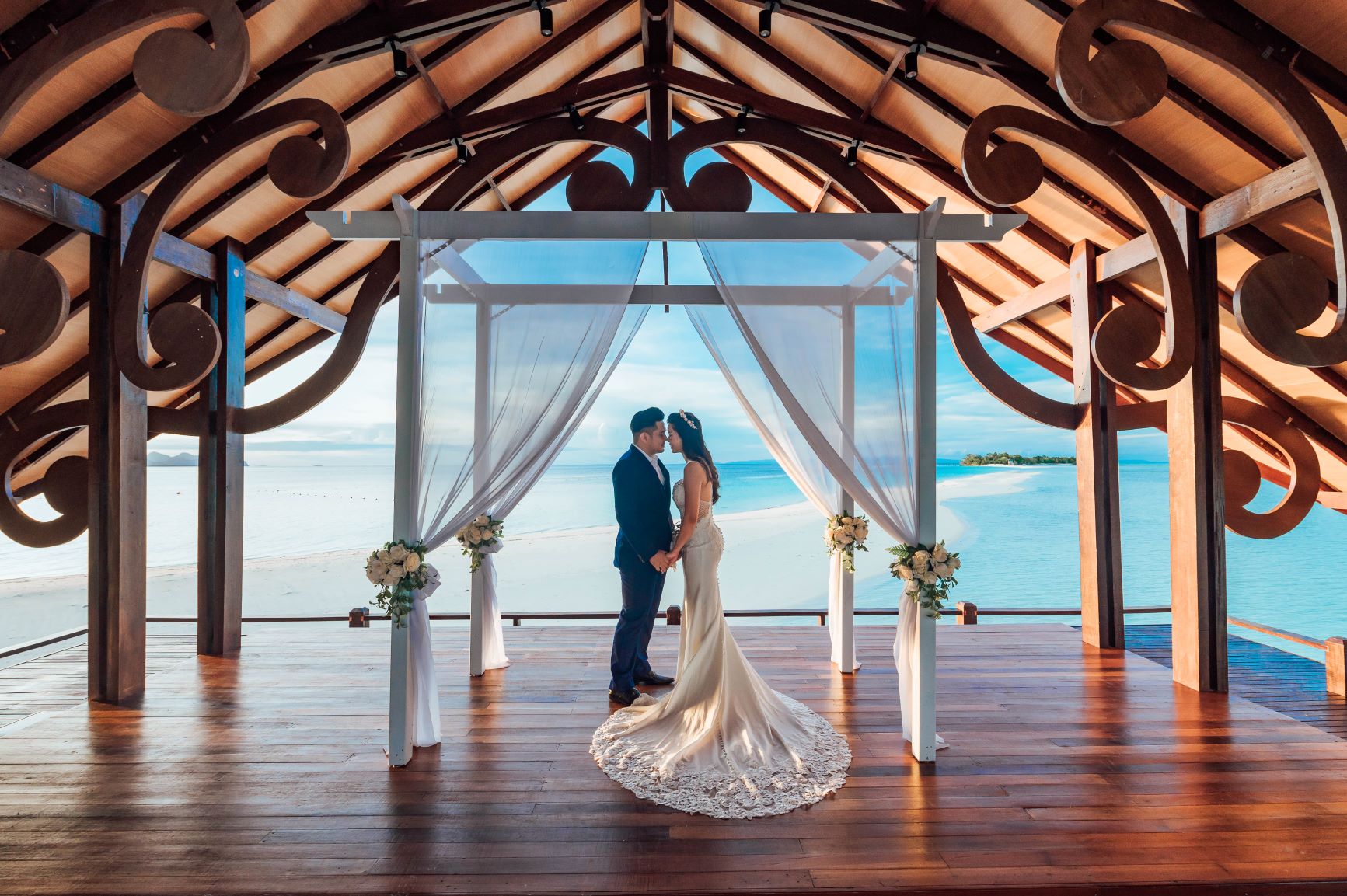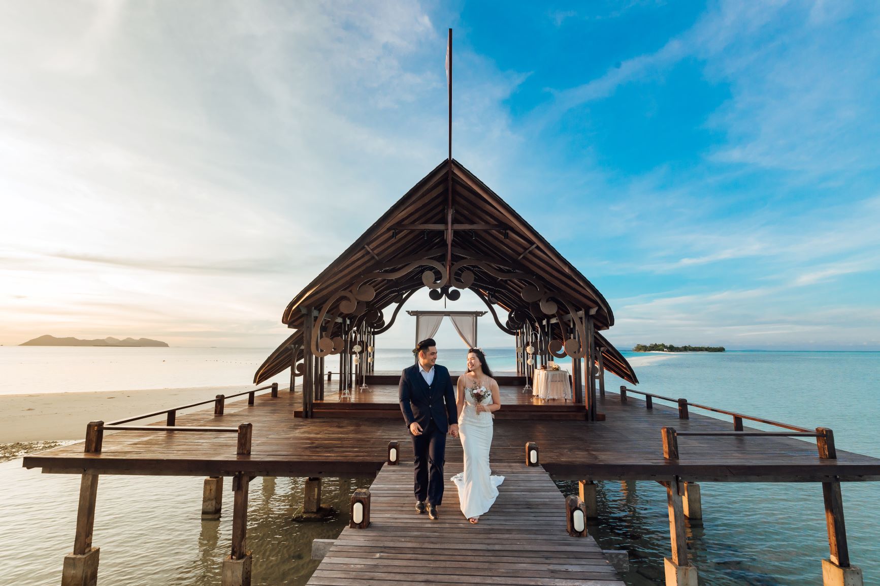There's nothing more precious than saying 'I do' to your significant other on our outdoor wedding chapel, exclusive for Mataking Reef Resort in-house guests; elegant dark-brown deck by the sea and gorgeous wooden chapel; with intricately carved asphalt shingle roof as an eye-catching decoration, vast Ocean as a magnificent backdrop surrounded by pristine tropical island vibe.